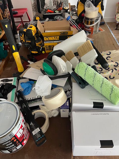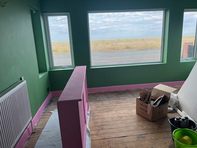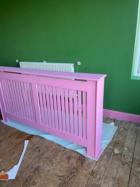 Then it was time to paint. I chose green for the walls and pink for the woodwork. I hate gloss paint so I had to sand and then do lots of fiddly stuff to the woodwork to get matt emulsion to stick to it. I have now been painting for days and days. Hence the distraction Substack post.